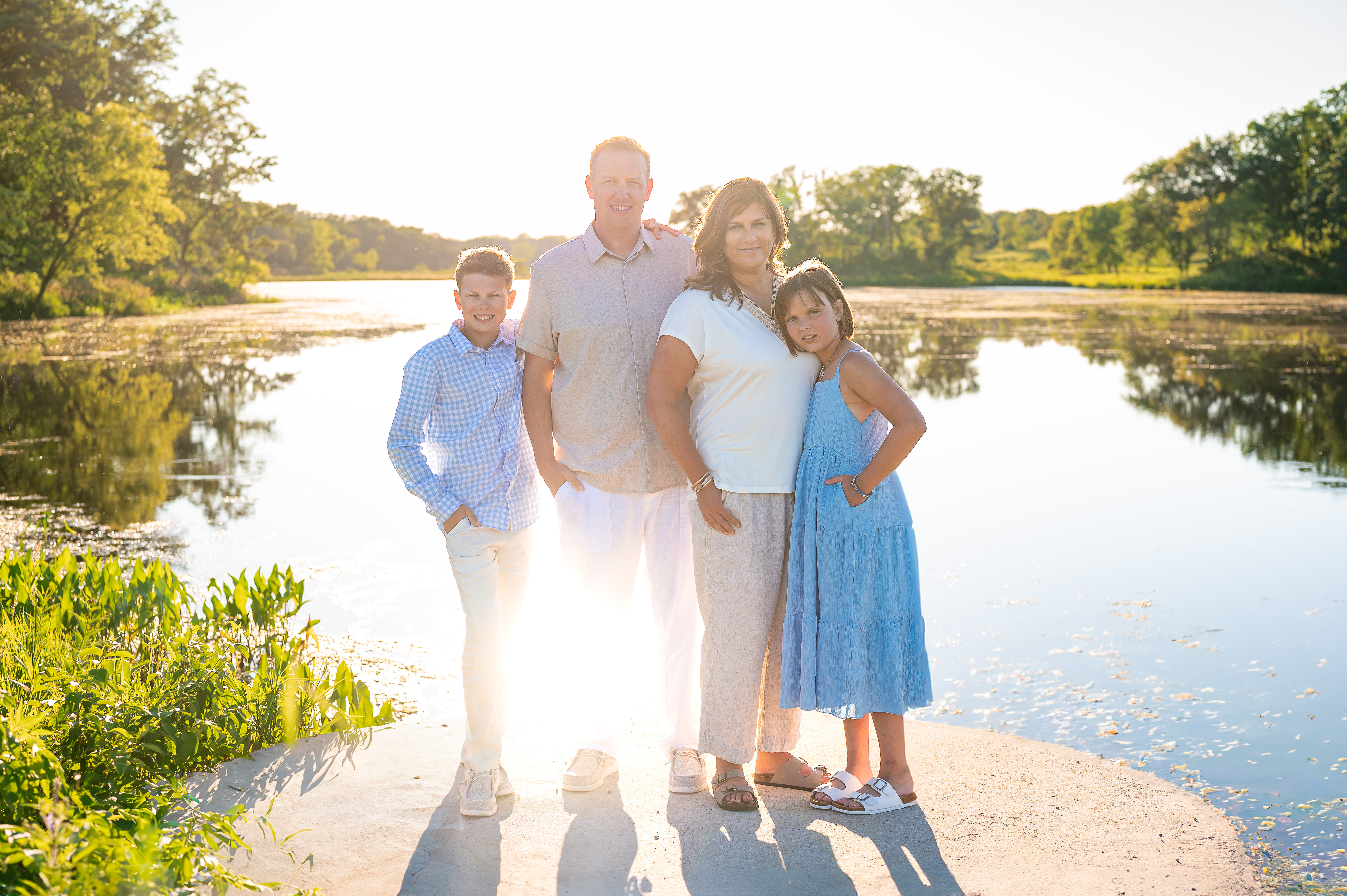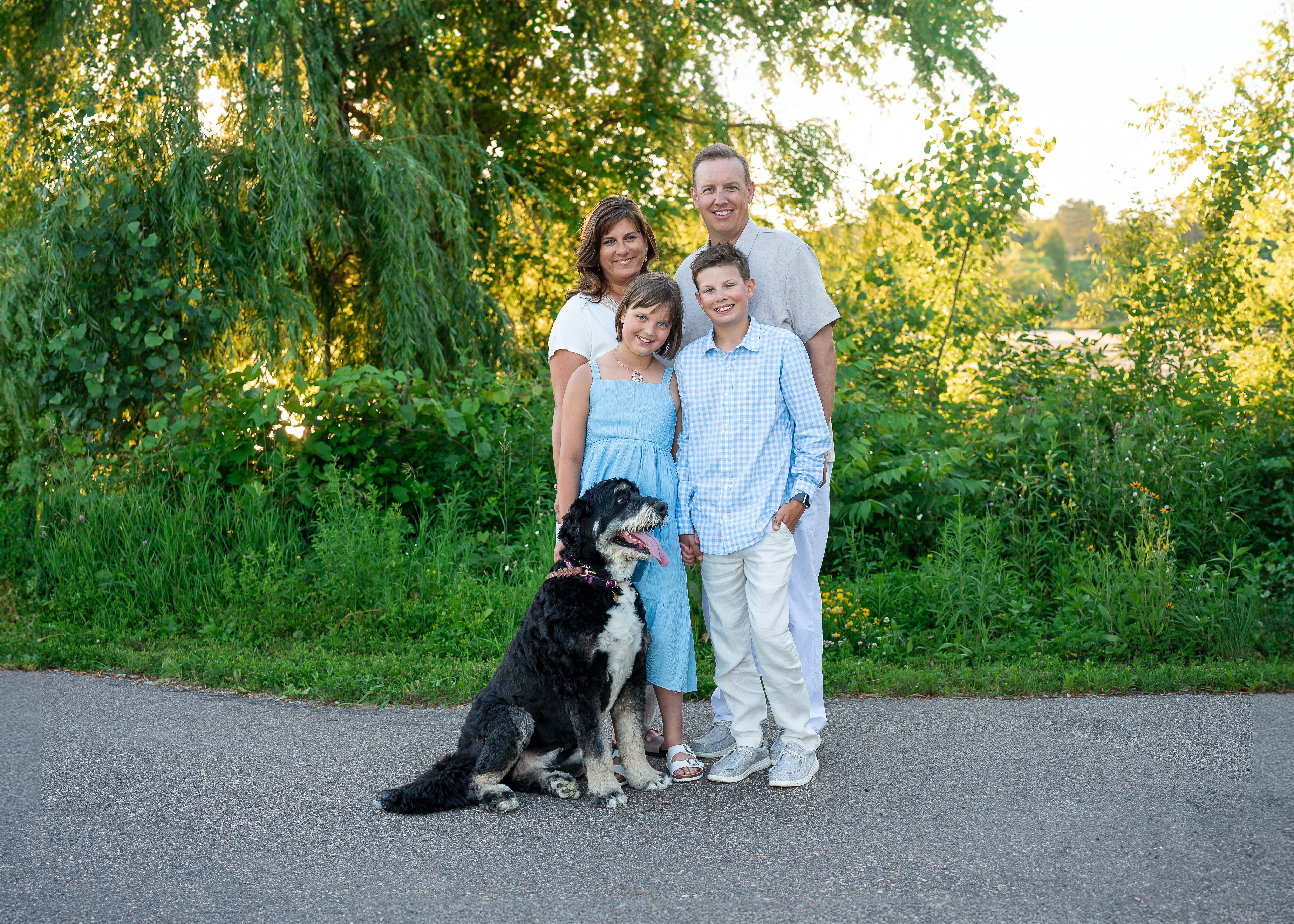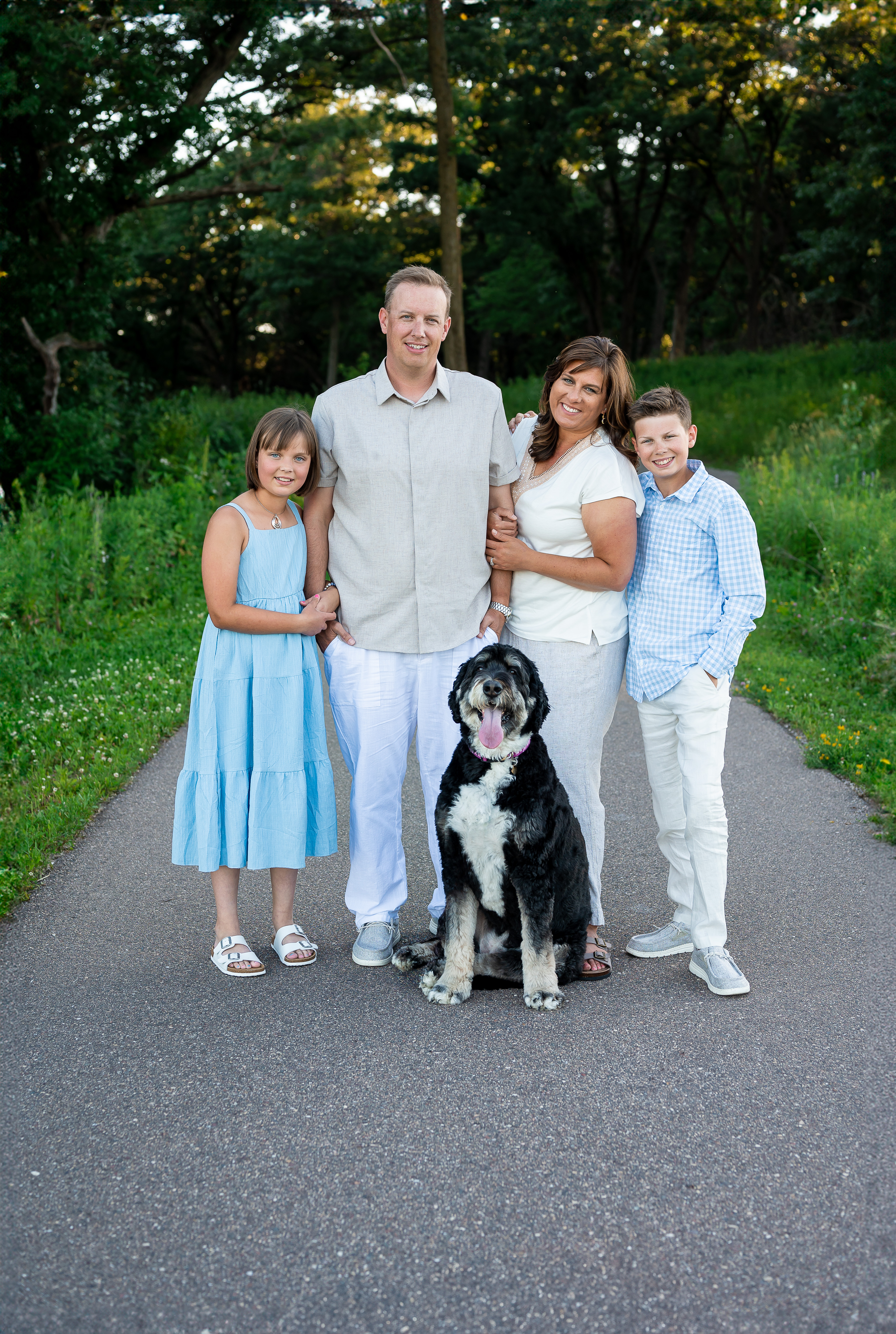 Family photo sessions are a wonderful way to capture the joy, love, and unique personalities of each family member—and when a furry friend is part of the equation, the experience becomes even more special! I recently had the pleasure of photographing the Smith family during their summer session at Whitetail Woods in Farmington, Minnesota, alongside their adorable Bernedoodle, Sophie. Together, they created beautiful memories that will last a lifetime. Whitetail Woods is one of the most picturesque locations in the area, featuring scenic trails, lush greenery, and tranquil ponds that showcase the beauty of nature in summer. As we arrived at the park, the sun was shining, and the vibrant wildflowers were in full bloom, providing the ideal backdrop for the Smith family’s photos. The warm weather and inviting atmosphere made it the perfect day for capturing moments together. Well…..except the bugs.