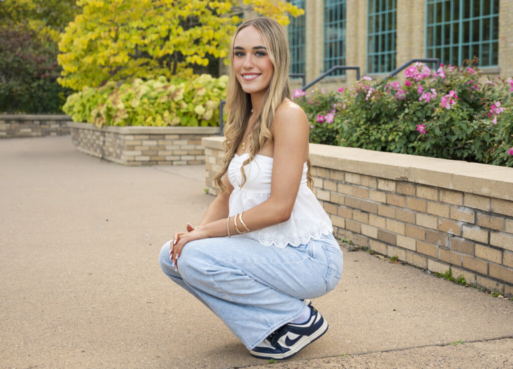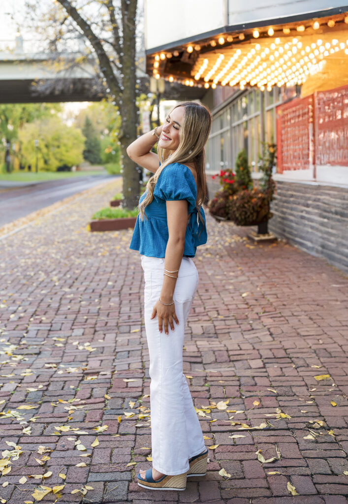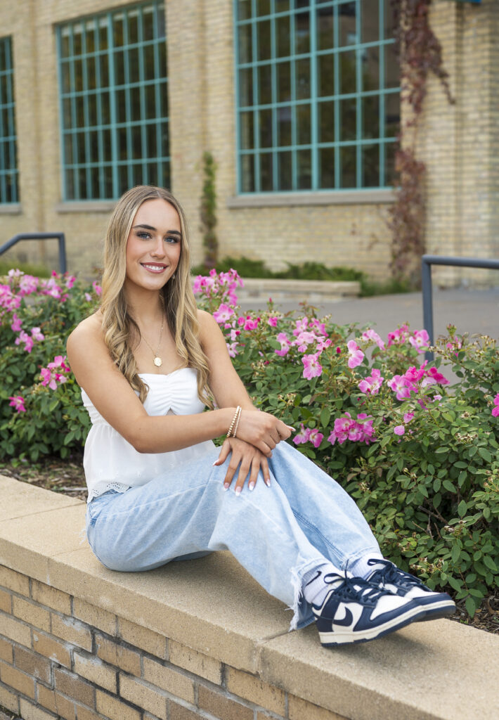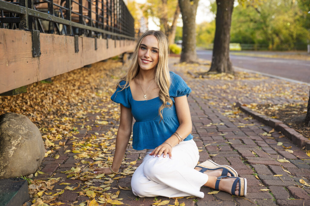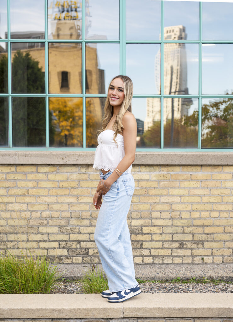 We started on the other side of the river, where there were still flowers hanging on late into the season, which felt like a little gift just for me. From there, we made our way over to St. Anthony Main, and wow. The warm evening light, the river views, and the charming streets came together perfectly. Everything about the area glowed as the sun started to set, and it created such a beautiful backdrop for Alexa’s senior photos.